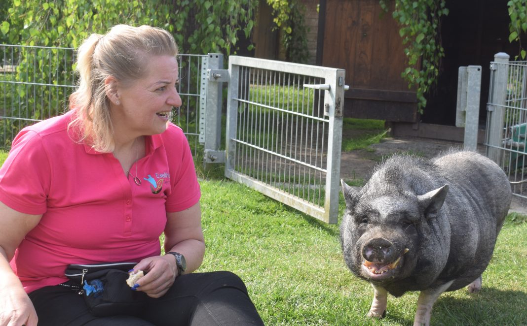 Weil unsere Tiere maximal zwei Mal täglich eingesetzt werden dürfen, haben wir 100 Tiere, um das auch gewährleisten zu können. Neben möglichst artgerechten Ställen und Gehegen dürfen die Tiere in ihrer Freizeit alles machen, was sie möchten, ob buddeln, suhlen, toben oder ähnliches. Die Hunde gehen mit mir zum Ausgleich einmal wöchentlich zur Hundeschule. Die anderen erhalten rund um die Uhr immer wieder Kuscheleinheiten von uns, wenn sie das möchten. Die Tiere werden in der Intervention zu nichts gezwungen: Möchte das Tier nicht, dann muss es nicht. Die Menschen, die zu uns kommen, lernen zuerst die Beziehungsarbeit zwischen ihnen und dem Tier kennen, um dann mit diesen Parcour, Spaziergänge oder ähnliches zu machen. Die Tiere spiegeln das Verhalten der Menschen, so kann ich das aufgreifen und mit den Menschen daran arbeiten (vereinfacht gesagt).