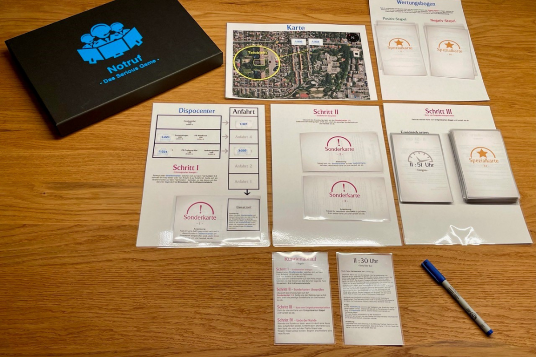 Bei dem Spiel, welches den Titel „Notruf – Das Serious Game“ trägt, handelt es sich um ein analoges, kooperatives Brettspiel, welches die Spieler*innen in die Rolle von Disponent*innen einer Polizeileitstelle versetzt. Gespielt wird hierbei mit einer beliebigen Gruppengröße, gemeinsam an einem Tisch. Durch Spielkarten werden die Ereignisse des Szenarios thematisch beschrieben und die Spieler*innen versuchen gemeinsam eine fiktive, herausfordernde Bedrohungslage zu bewältigen, Entscheidungen zu treffen und Anweisungen zu geben, um möglichst viele Punkte zu erzielen. Gleichzeitig erlernen und vertiefen die Spieler*innen hierbei Dienstvorschriften, Leitfäden der Polizei, sowie die Strukturen einer besonderen Aufbauorganisation.
